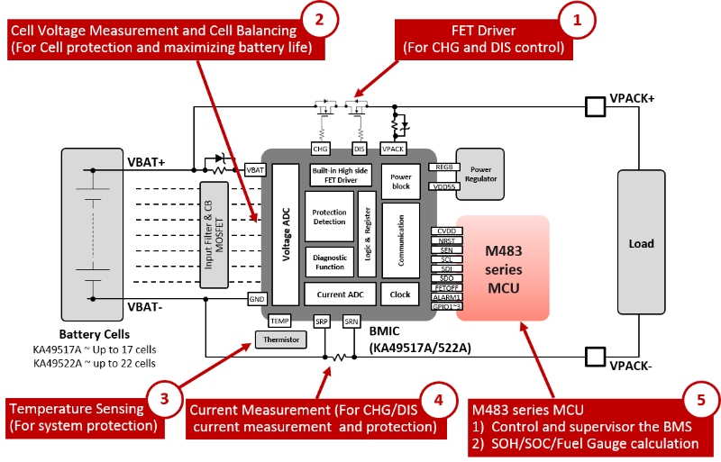 KA49517A/522A is a high accuracy battery monitoring IC (BMIC) with a protection function suitable for industrial applications. It has many BMS functions integrated into one chip, making system design simple and easy. Pin-to-pin compatible series also enables a flexible and scalable design. Combined with the high performance, high speed, and low power NuMicro® M483 CAN MCU. This solution achieved a highly reliable and safe BMS system.
