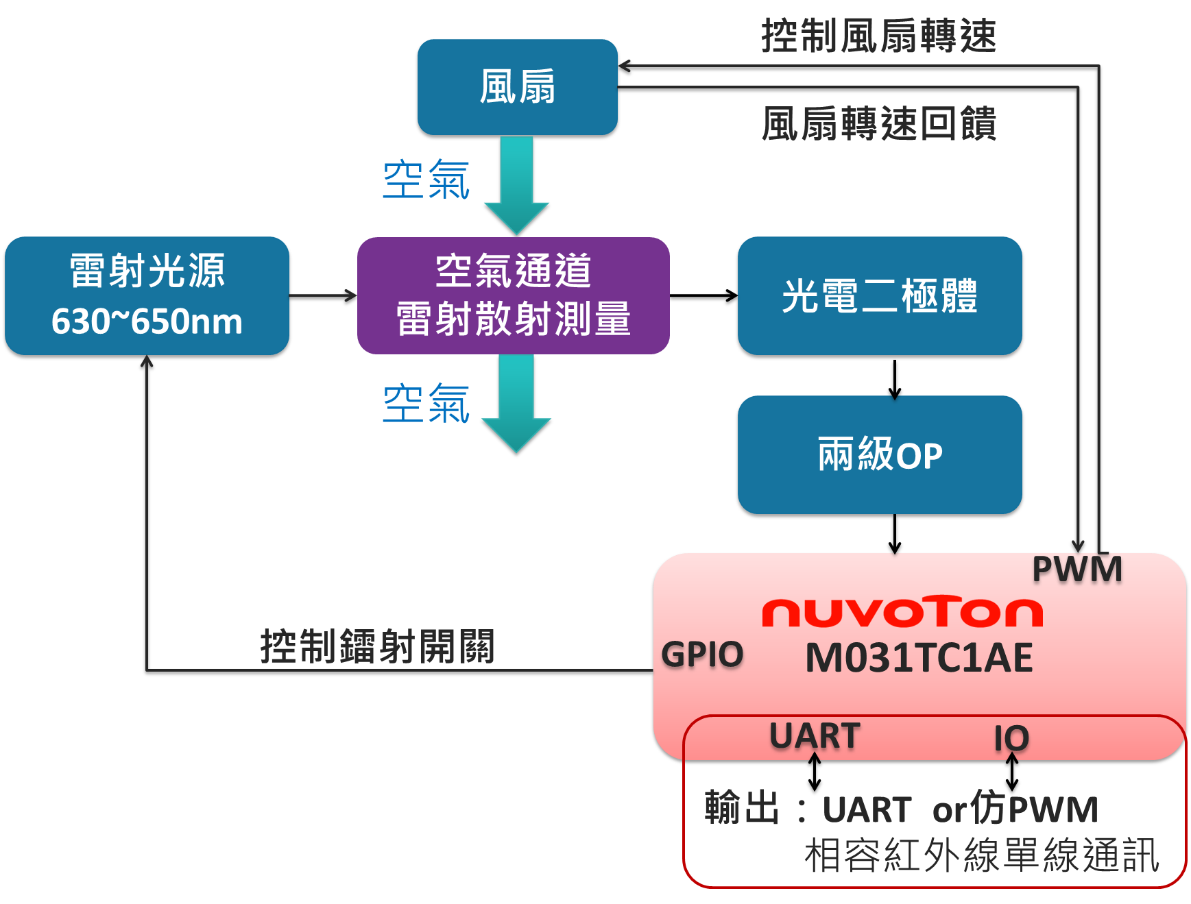 • PM2.5 雷射模組:主控採用 M031 微控制器 (32 位 Arm® Cortex®-M0,內置 2 Msps ADC)