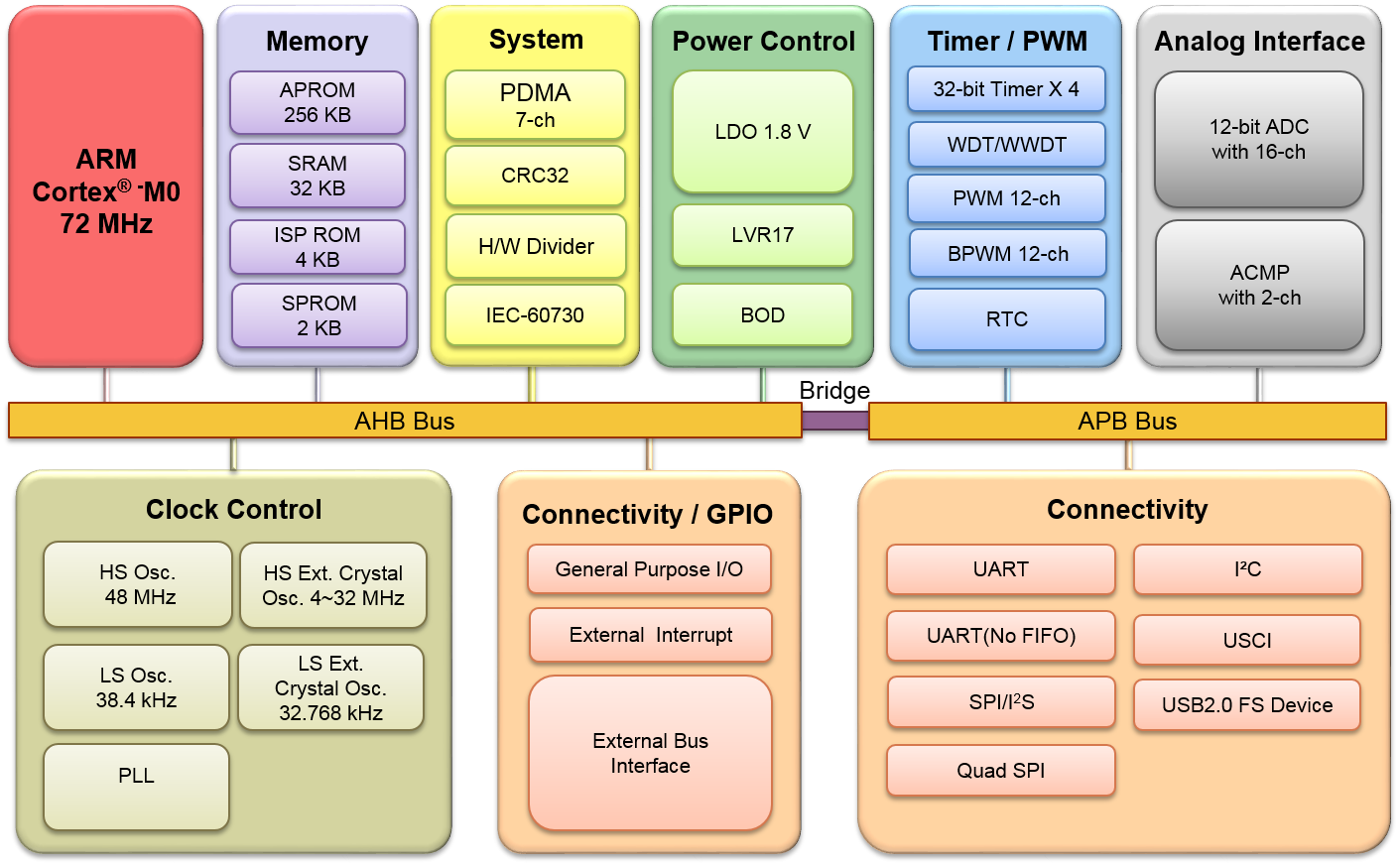 With its special designed performance such as 2 MSPS ADC , 144 MHz PWM , 24 MHz SPI , 7.2 MHz UART . It can be applied at industrial control and consumer applications, provide a fast and precise data conversion of the voltage, current and sensor data, and fast response control for the external device, such as the current/voltage feedback from motor control or sensing devices.
