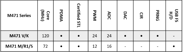 - M471 V/K Series – Provides 120 MHz core speed, 512 KB Flash, 64 KB SRAM, customize IR receiver (CIR), up to 24-ch, 16-bit PWM, 1 set of 12-bit, 1.8 MSPS ADC, 1 set of 8-bit, 200 kSPS DAC, 2 sets of analog comparators, and pseudo random number generator (PRNG).