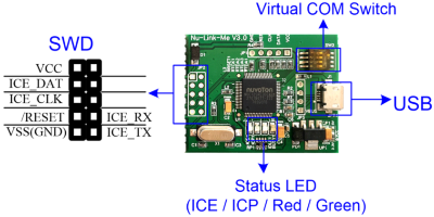 | Nu-Link2-Me | A basic debugger/programmer, through the resistor to adjust SWD interface voltage : • USB 2.0 HS to SWD interface • SWD interface up to 12 Mbps • On-line/off-line ISP firmware update : UART • Hardware setting SWD interface voltage : 1.8V, 3.3 V, 5.0 V • Virtual COM port |